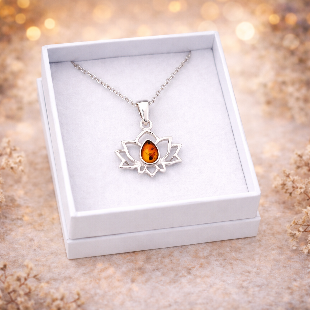 Stříbrný přívěsek s jantarem - Lotosový květ + dárková krabička a nerezový řetízek