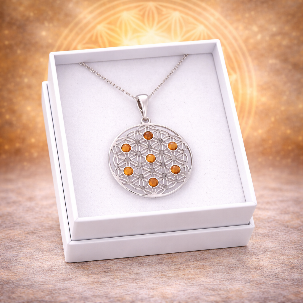 Stříbrný přívěsek s jantarem - XXL Květ života + dárková krabička a nerezový řetízek
