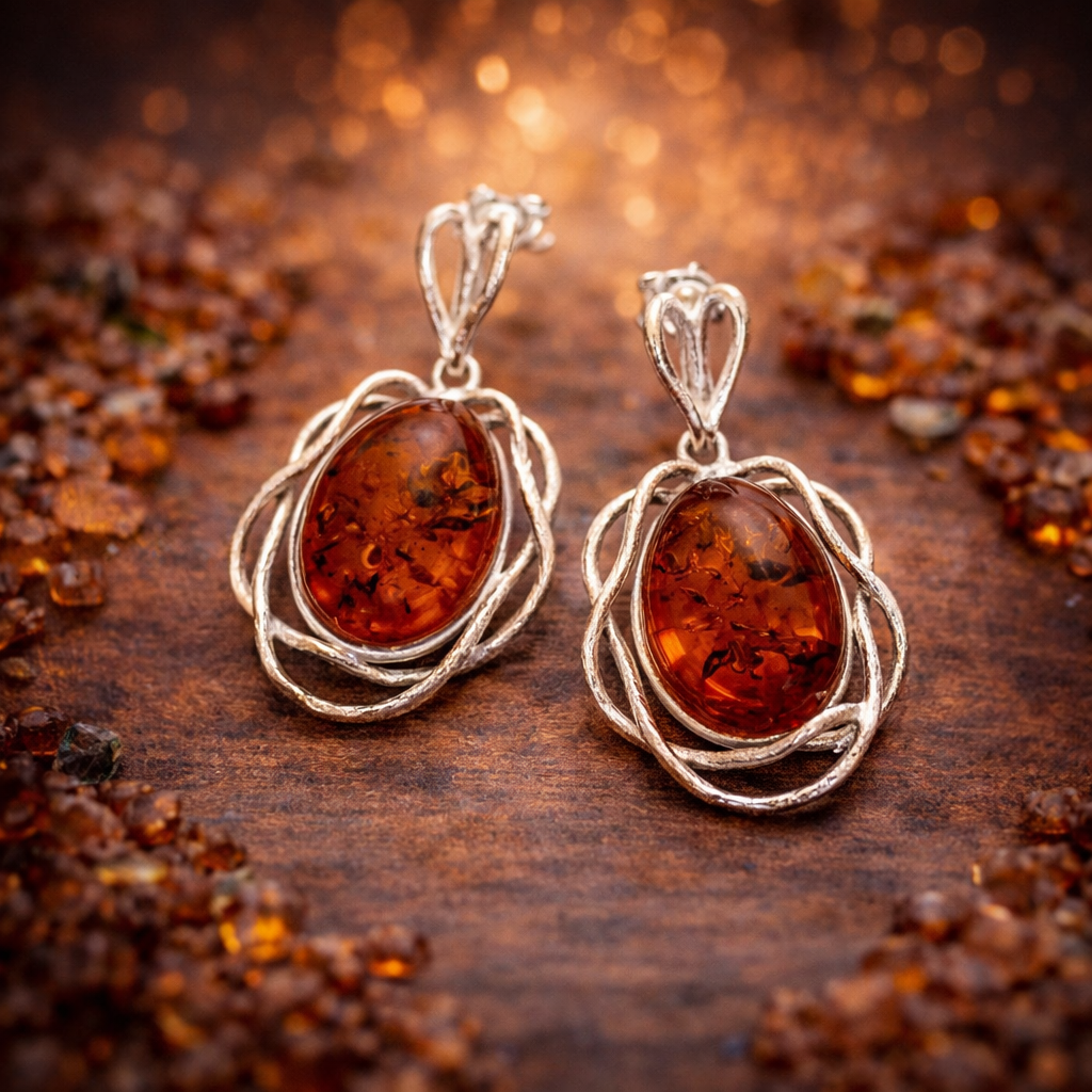 Dominantou náušnic je oválný jantar v koňakovém odstínu o velikosti 13 × 18 mm, pocházející z oblasti Baltského moře. Přirozená kresba jantaru je u každého kusu jedinečná a v kombinaci s jemně tvarovaným stříbrným rámem vytváří harmonický, ale zároveň velmi výrazný celek.